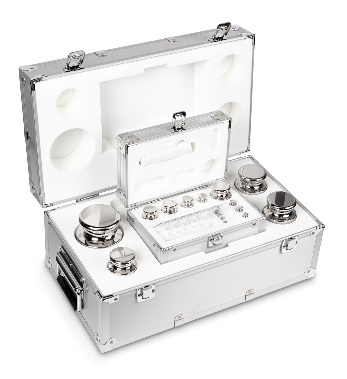 Conjunto de pesos STWE2g1kg5: classe OIML E2, forma del peso Pulsante, materiale Acciaio inossidabile lucidato, valore nominale 1 g; 5 kg, astuccio del kit di pesi in valigetta di alluminio